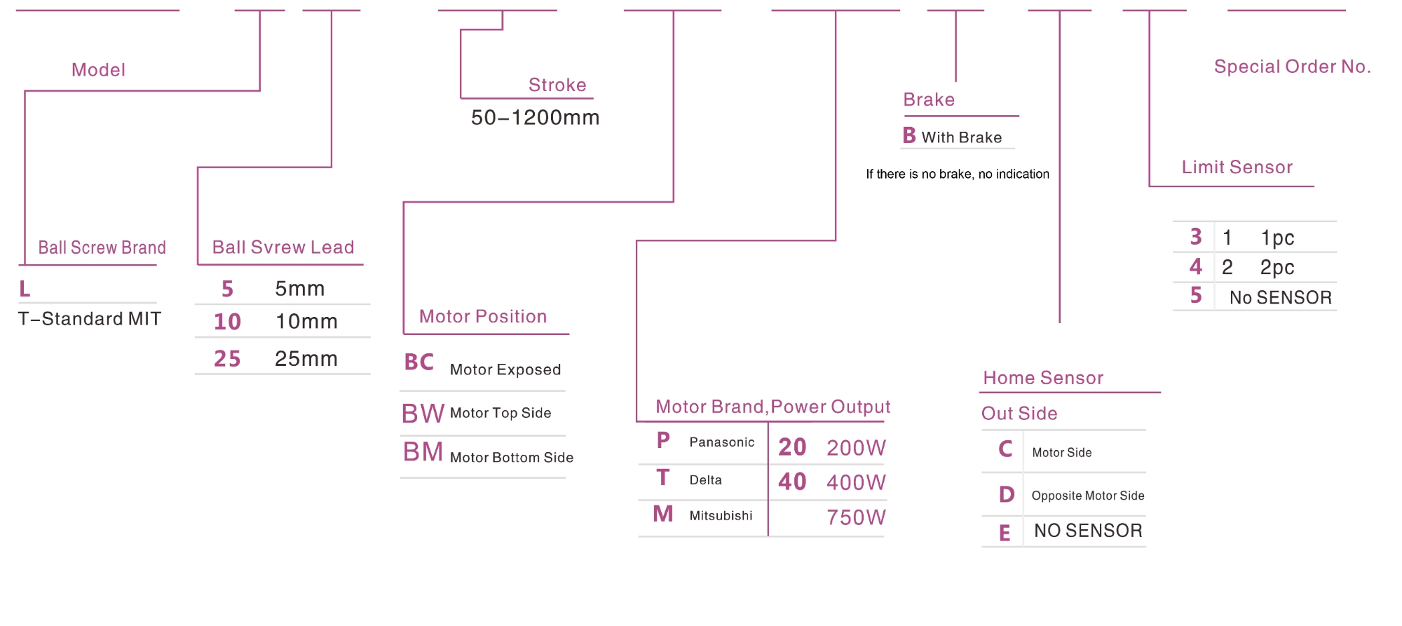 | ใช้ที่ไหน | โหมดขับเคลื่อน | ข้อมูลจำเพาะของรุ่น | กำลังไฟฟ้าขาออก (วัตต์) | ความกว้าง (มม.) | ความแม่นยำในการวัดซ้ำ (มม.) | ข้อมูลจำเพาะของบอลสกรู | น้ำหนักบรรทุกสูงสุด (กก.) | ความเร็วสูงสุด (มม./วินาที) *1 | ||
