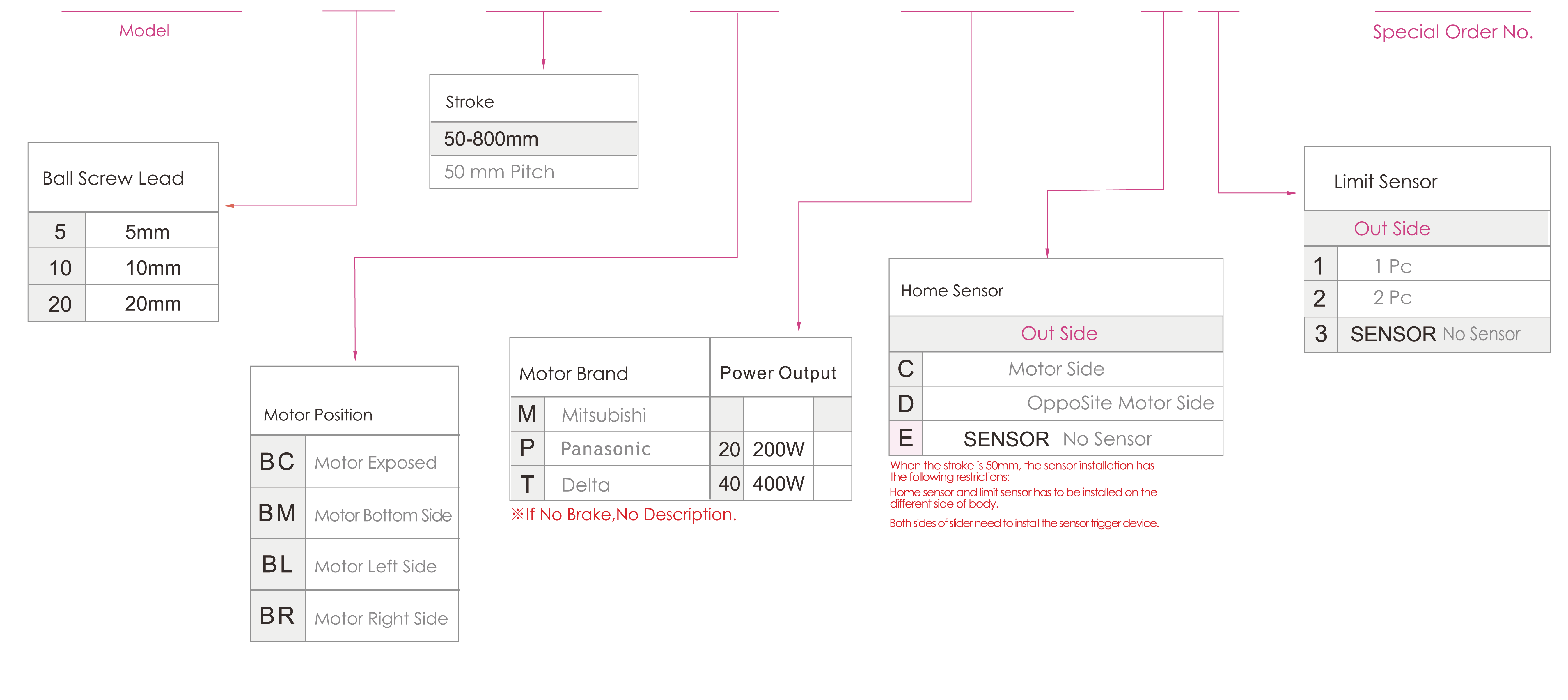 | ใช้ที่ไหน | โหมดขับเคลื่อน | ข้อมูลจำเพาะของรุ่น | กำลังไฟฟ้าขาออก (วัตต์) | ความกว้าง (มม.) | ความแม่นยำในการวัดซ้ำ (มม.) | ข้อมูลจำเพาะของบอลสกรู | น้ำหนักบรรทุกสูงสุด (กก.) | ความเร็วสูงสุด (มม./วินาที) *1 | ||