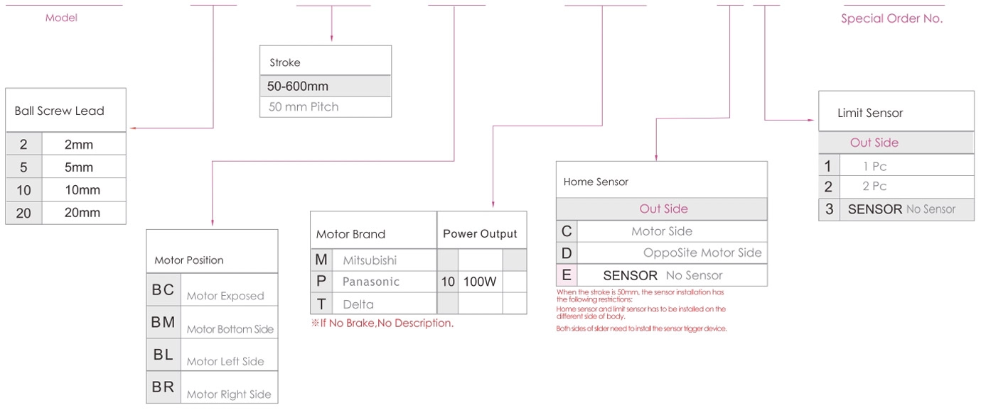 | ใช้ที่ไหน | โหมดขับเคลื่อน | ข้อมูลจำเพาะของรุ่น | กำลังไฟฟ้าขาออก (วัตต์) | ความกว้าง (มม.) | ความแม่นยำในการวัดซ้ำ (มม.) | ข้อมูลจำเพาะของบอลสกรู | น้ำหนักบรรทุกสูงสุด (กก.) | ความเร็วสูงสุด (มม./วินาที) *1 | ||