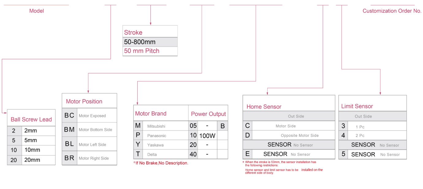| ใช้ที่ไหน | โหมดขับเคลื่อน | ข้อมูลจำเพาะของรุ่น | เอาต์พุตมอเตอร์ (ว) | ความกว้าง (มม.) | ความสามารถในการทำซ้ำ (มม.) | ข้อมูลจำเพาะของบอลสกรู | น้ำหนักบรรทุกสูงสุด (กก.) | ความเร็วสูงสุด (มม./วินาที) *1 | ||