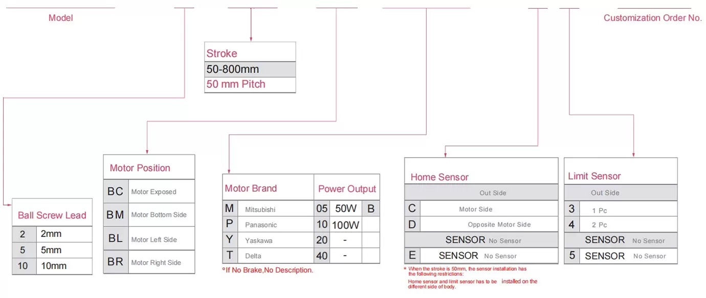 | ใช้ที่ไหน | โหมดขับเคลื่อน | ข้อมูลจำเพาะของรุ่น | เอาต์พุตมอเตอร์ (ว) | ความกว้าง (มม.) | ความสามารถในการทำซ้ำ (มม.) | ข้อมูลจำเพาะของบอลสกรู | น้ำหนักบรรทุกสูงสุด (กก.) | ความเร็วสูงสุด (มม./วินาที) *1 | ||