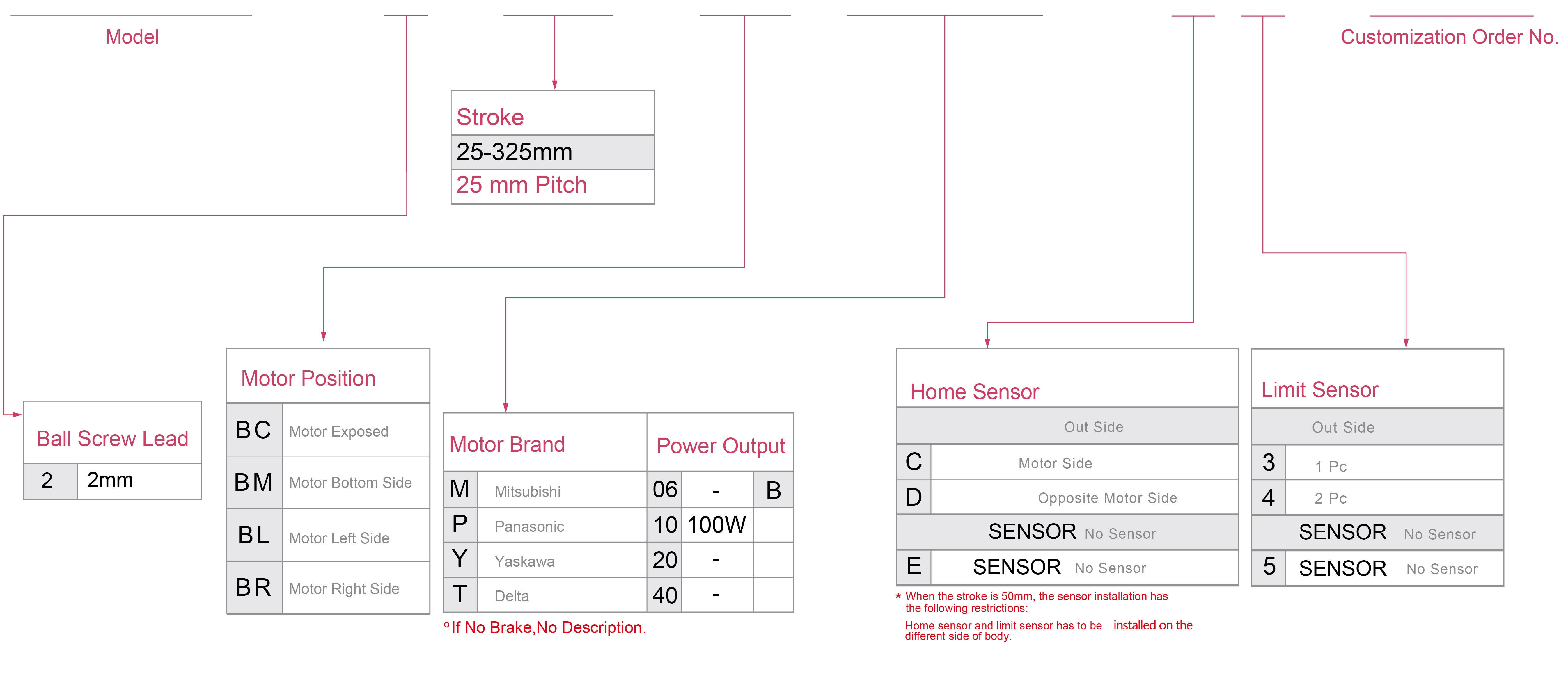 | ใช้ที่ไหน | โหมดขับเคลื่อน | ข้อมูลจำเพาะของรุ่น | เอาต์พุตมอเตอร์ (ว) | ความกว้าง (มม.) | ความสามารถในการทำซ้ำ (มม.) | ข้อมูลจำเพาะของบอลสกรู | น้ำหนักบรรทุกสูงสุด (กก.) | ความเร็วสูงสุด (มม./วินาที) *1 | ||