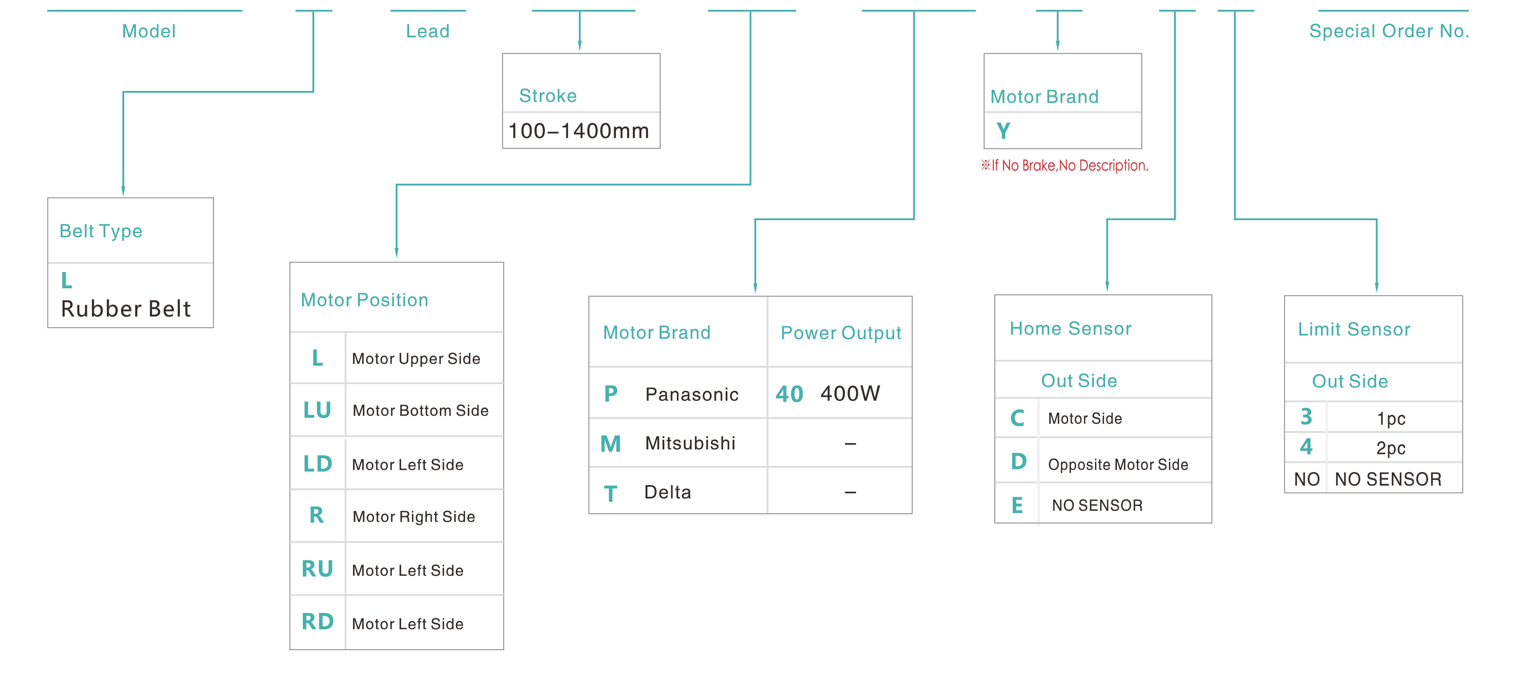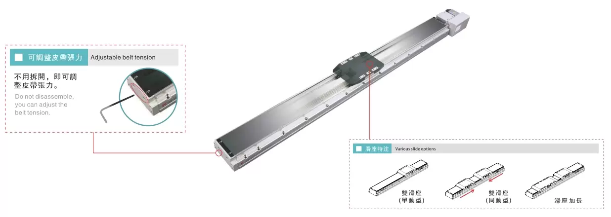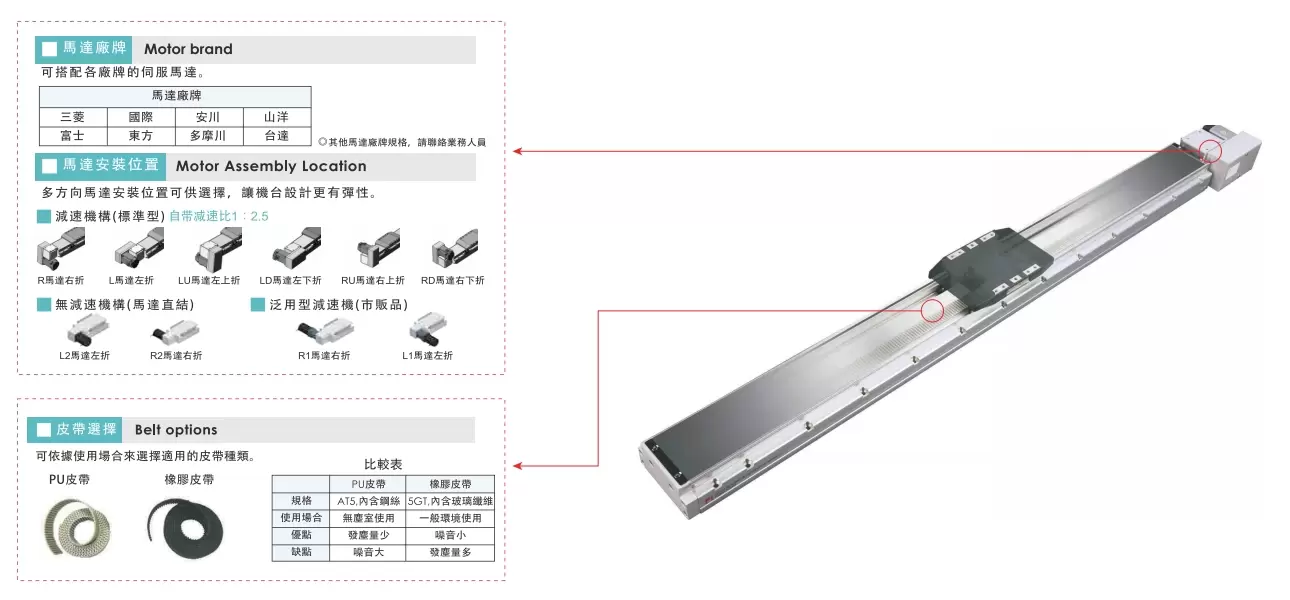 | ใช้ที่ไหน | โหมดขับเคลื่อน | ข้อมูลจำเพาะของรุ่น | กลไกการลด | เอาต์พุตมอเตอร์ (ว) | ความกว้าง (มม.) | ความสามารถในการทำซ้ำ (มม.) | ข้อมูลจำเพาะของสายพาน | น้ำหนักบรรทุกสูงสุด (กก.) | ความเร็วสูงสุด (มม./วินาที) *1 | ||