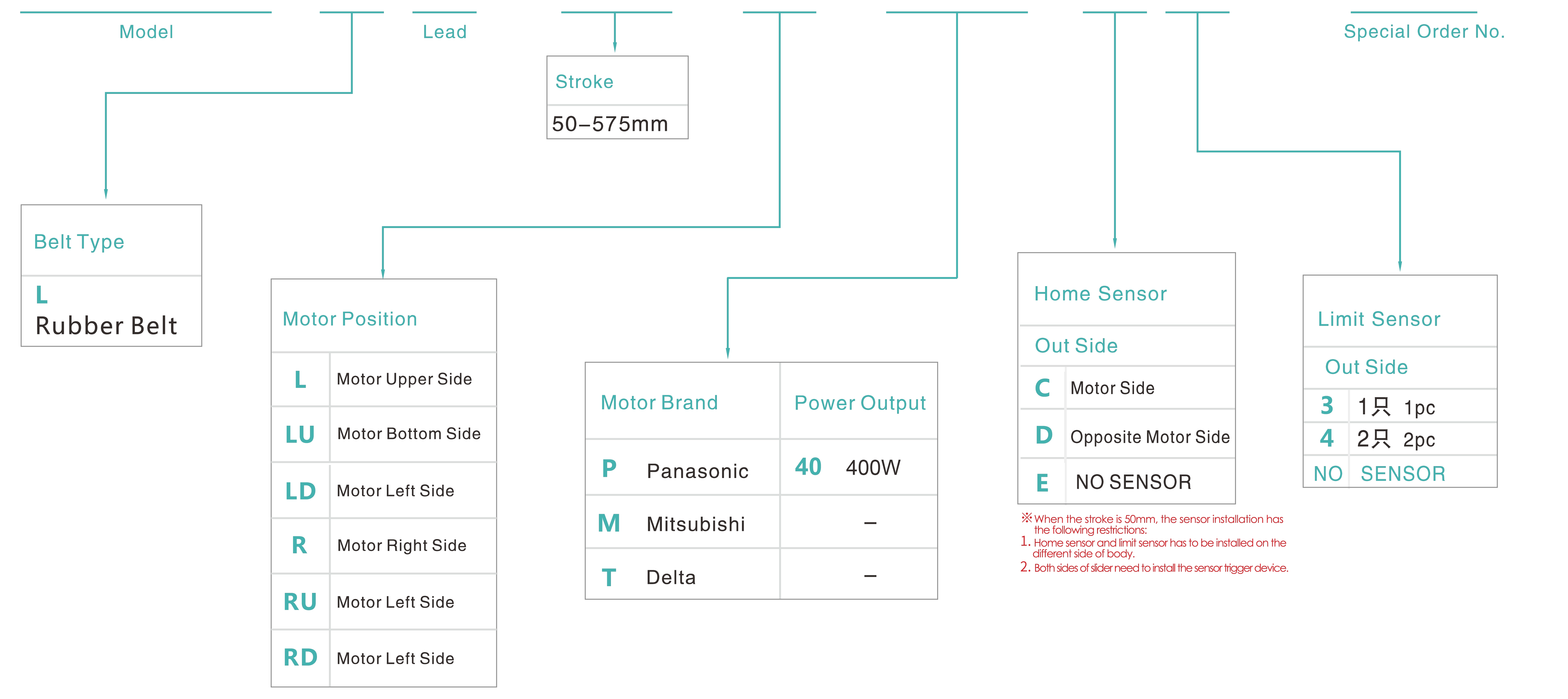 | ใช้ที่ไหน | โหมดขับเคลื่อน | ข้อมูลจำเพาะของรุ่น | กลไกการลด | เอาต์พุตมอเตอร์ (ว) | ความกว้าง (มม.) | ความสามารถในการทำซ้ำ (มม.) | ข้อมูลจำเพาะของสายพาน | น้ำหนักบรรทุกสูงสุด (กก.) | ความเร็วสูงสุด (มม./วินาที) *1 | ||