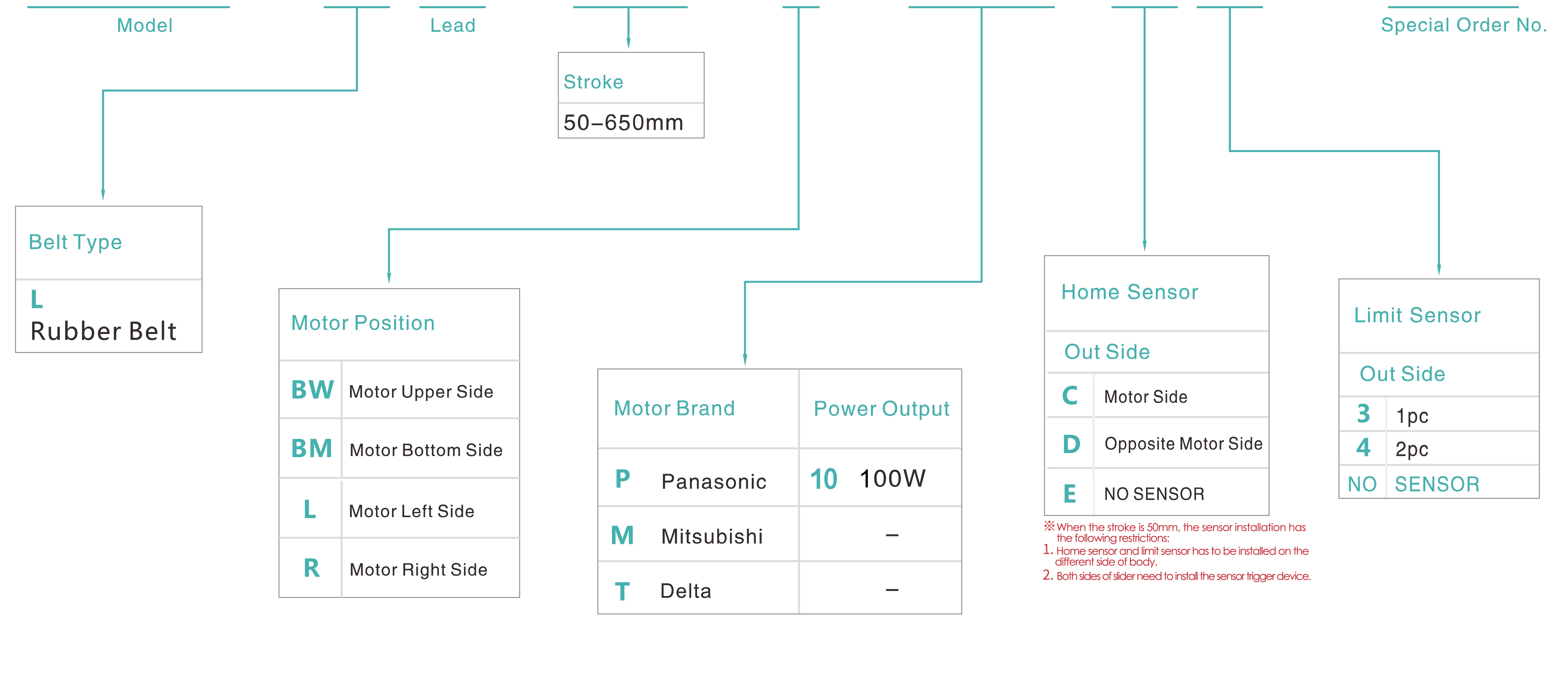 | ใช้ที่ไหน | โหมดขับเคลื่อน | ข้อมูลจำเพาะของรุ่น | กลไกการลด | เอาต์พุตมอเตอร์ (ว) | ความกว้าง (มม.) | ความสามารถในการทำซ้ำ (มม.) | ข้อมูลจำเพาะของสายพาน | น้ำหนักบรรทุกสูงสุด (กก.) | ความเร็วสูงสุด (มม./วินาที) *1 | ||
