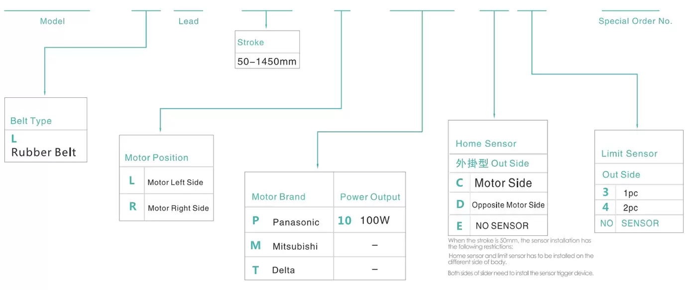 | ใช้ที่ไหน | โหมดขับเคลื่อน | ข้อมูลจำเพาะของรุ่น | กลไกการลด | เอาต์พุตมอเตอร์ (ว) | ความกว้าง (มม.) | ความสามารถในการทำซ้ำ (มม.) | ข้อมูลจำเพาะของสายพาน | น้ำหนักบรรทุกสูงสุด (กก.) | ความเร็วสูงสุด (มม./วินาที) *1 | ||