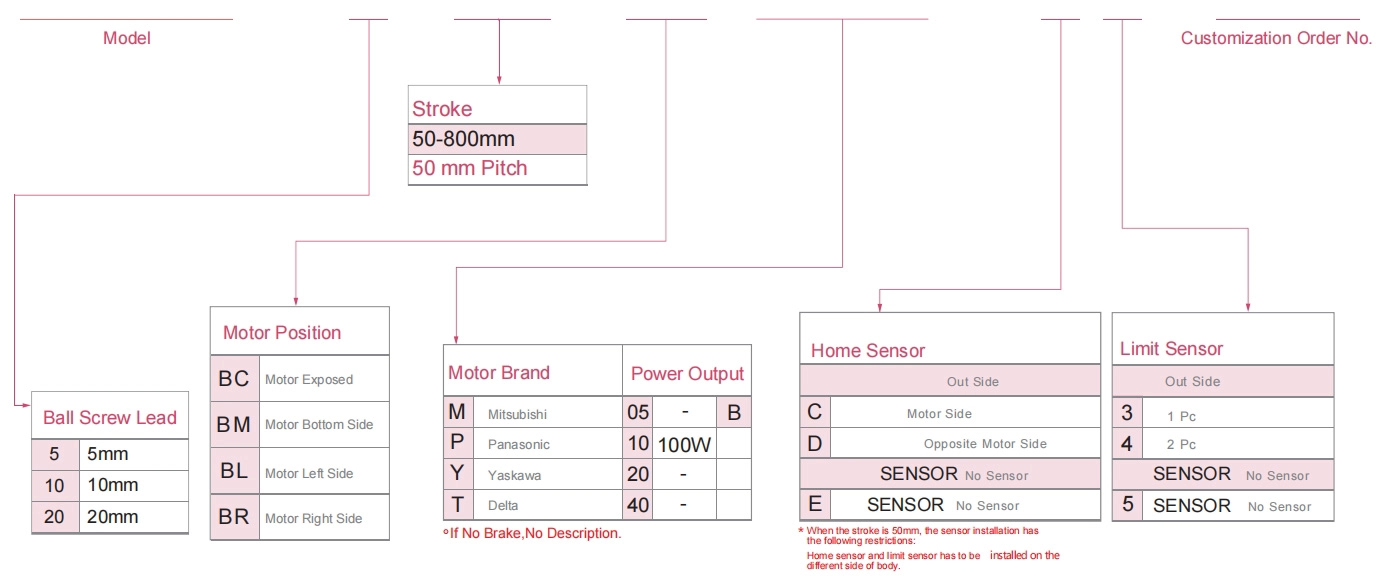 | ใช้ที่ไหน | โหมดขับเคลื่อน | ข้อมูลจำเพาะของรุ่น | เอาต์พุตมอเตอร์ (ว) | ความกว้าง (มม.) | ความสูงของร่างกาย (มม.) | ความสามารถในการทำซ้ำ (มม.) | ข้อมูลจำเพาะของบอลสกรู | น้ำหนักบรรทุกสูงสุด (กก.) | ความเร็วสูงสุด (มม./วินาที) *1 | ||||||||||