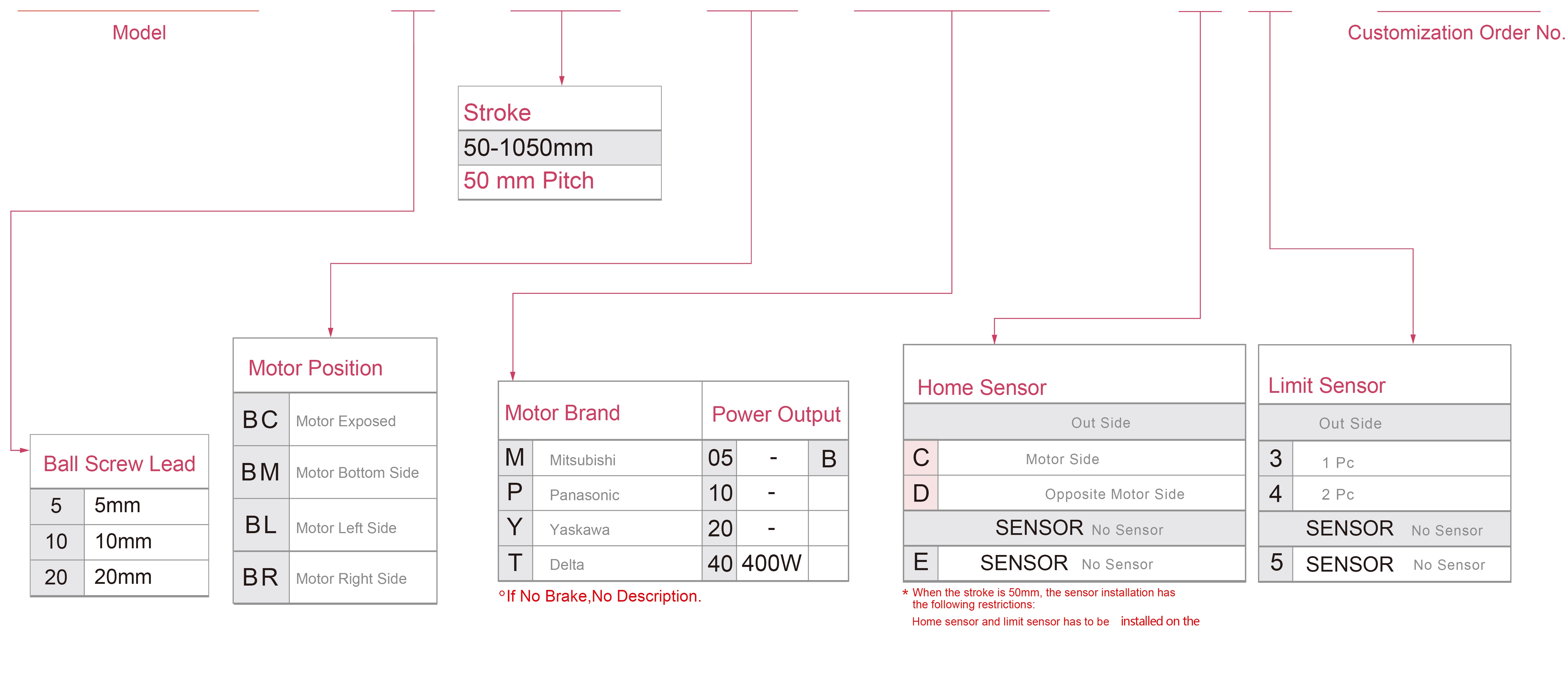 | ใช้ที่ไหน | โหมดขับเคลื่อน | ข้อมูลจำเพาะของรุ่น | เอาต์พุตมอเตอร์ (ว) | ความกว้าง (มม.) | ความสูงของร่างกาย (มม.) | ความสามารถในการทำซ้ำ (มม.) | ข้อมูลจำเพาะของบอลสกรู | น้ำหนักบรรทุกสูงสุด (กก.) | ความเร็วสูงสุด (มม./วินาที) *1 | ||||||||||