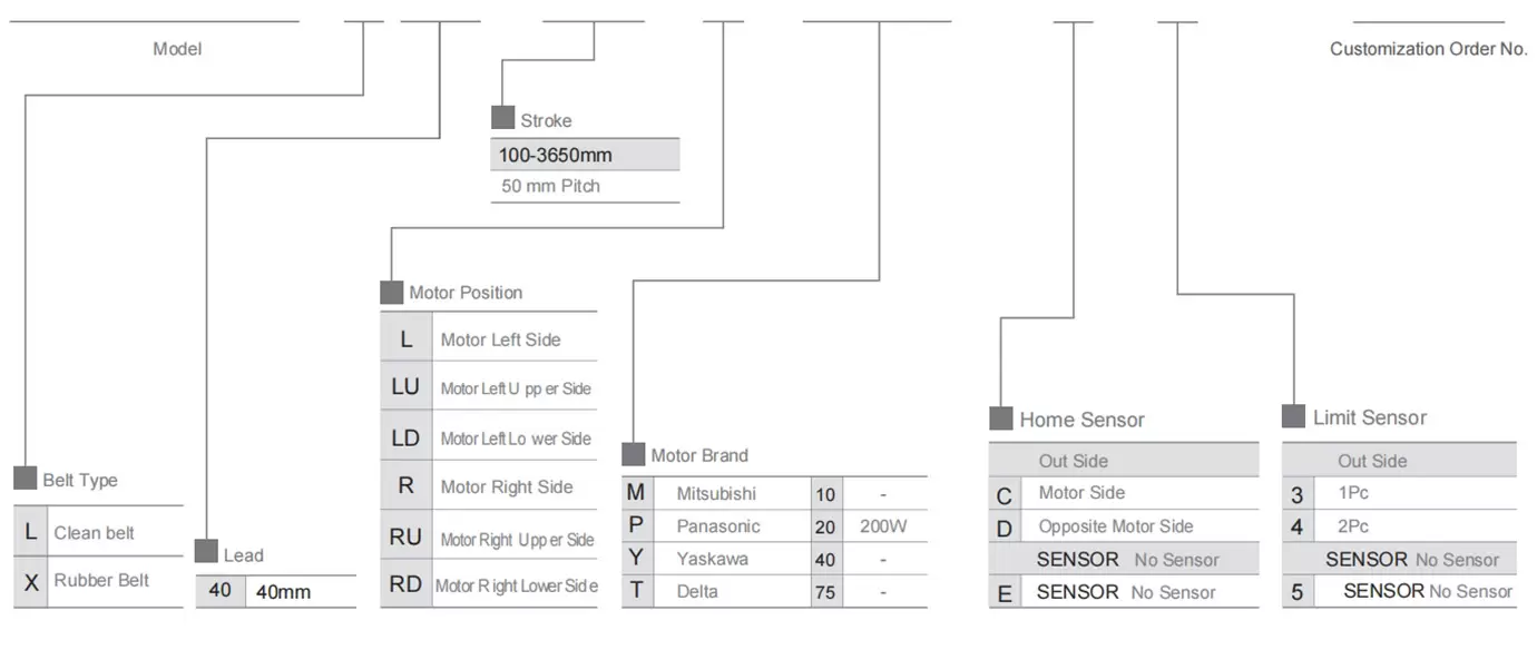 | ใช้ที่ไหน | โหมดขับเคลื่อน | ข้อมูลจำเพาะของรุ่น | กลไกการลด | เอาต์พุตมอเตอร์ (ว) | ความกว้าง (มม.) | ความสูงของร่างกาย (มม.) | ความสามารถในการทำซ้ำ (มม.) | ข้อมูลจำเพาะของสายพาน | น้ำหนักบรรทุกสูงสุด (กก.) | ความเร็วสูงสุด (มม./วินาที) *1 | ||