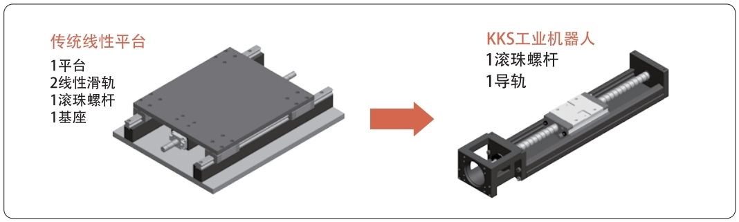 หุ่นยนต์อุตสาหกรรม KKS ออกแบบเป็นแบบโมดูลาร์ โดยผสานรวมสกรูบอลและรางเลื่อนเชิงเส้น ซึ่งช่วยลดข้อเสียของแพลตฟอร์มการขับเคลื่อนแบบดั้งเดิม เช่น การเลือก การติดตั้ง และการปรับเทียบชิ้นส่วนนำทางและขับเคลื่อน ปริมาณที่มาก และการประเมินพื้นที่