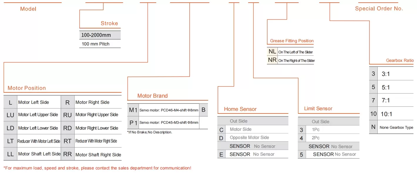 | ใช้ที่ไหน | โหมดขับเคลื่อน | ข้อมูลจำเพาะของรุ่น | กลไกการลด | เอาต์พุตมอเตอร์ (ว) | ความกว้าง (มม.) | ความสามารถในการทำซ้ำ (มม.) | ข้อมูลจำเพาะของสายพาน | น้ำหนักบรรทุกสูงสุด (กก.) | ความเร็วสูงสุด (มม./วินาที) *1 | ||