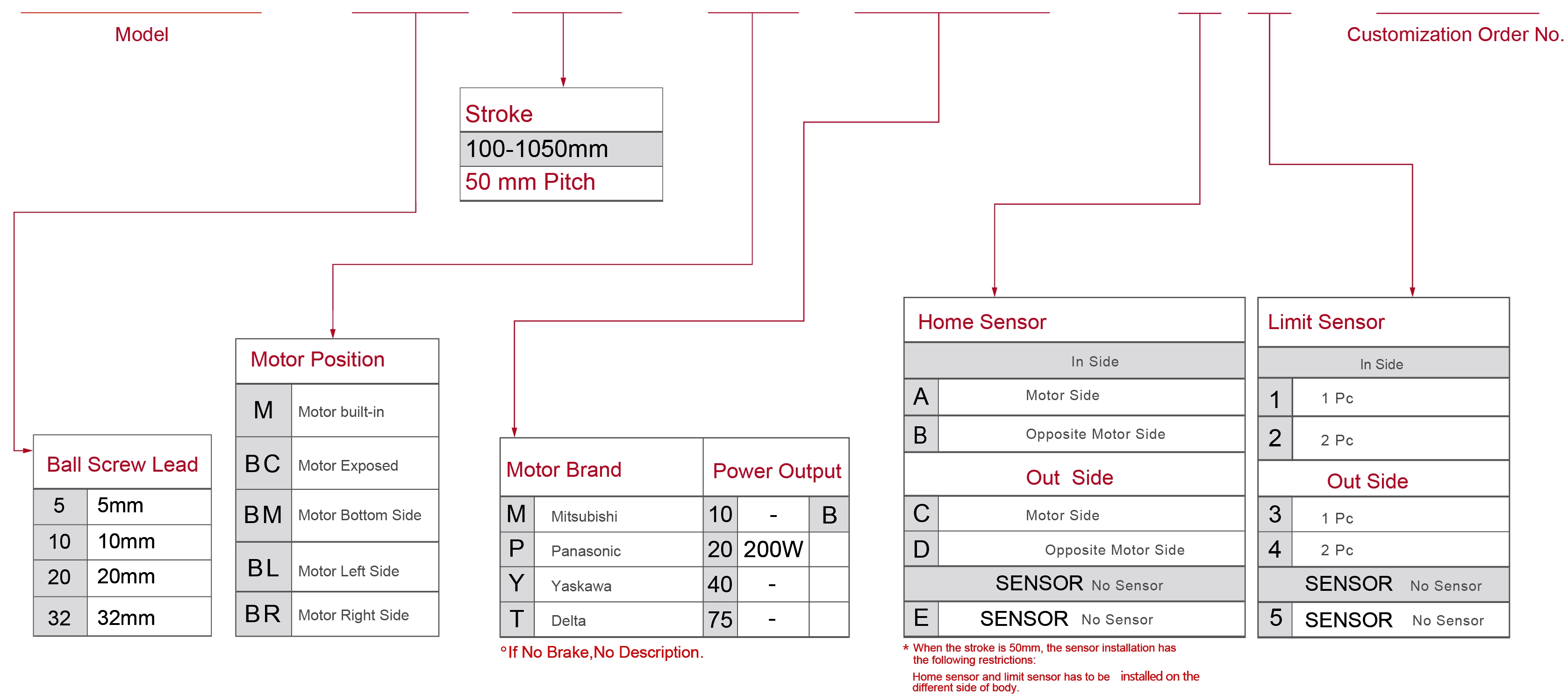 | ใช้ที่ไหน | โหมดขับเคลื่อน | ข้อมูลจำเพาะของรุ่น | เอาต์พุตมอเตอร์ (ว) | ความกว้าง (มม.) | ความสามารถในการทำซ้ำ (มม.) | ข้อมูลจำเพาะของบอลสกรู | น้ำหนักบรรทุกสูงสุด (กก.) | ความเร็วสูงสุด (มม./วินาที) *1 | ||
