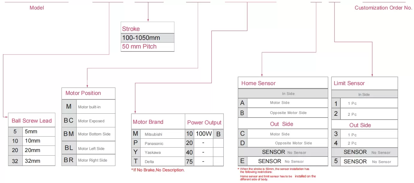 | ใช้ที่ไหน | โหมดขับเคลื่อน | ข้อมูลจำเพาะของรุ่น | เอาต์พุตมอเตอร์ (ว) | ความกว้าง (มม.) | ความสามารถในการทำซ้ำ (มม.) | ข้อมูลจำเพาะของบอลสกรู | น้ำหนักบรรทุกสูงสุด (กก.) | ความเร็วสูงสุด (มม./วินาที) *1 | ||