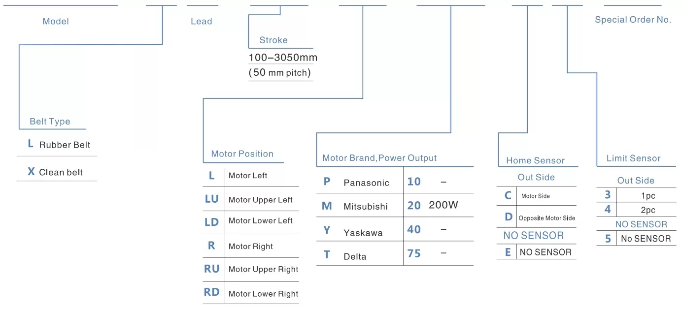 | ใช้ที่ไหน | โหมดขับเคลื่อน | ข้อมูลจำเพาะของรุ่น | กลไกการลด | เอาต์พุตมอเตอร์ (ว) | ความกว้าง (มม.) | ความสามารถในการทำซ้ำ (มม.) | ข้อมูลจำเพาะของสายพาน | น้ำหนักบรรทุกสูงสุด (กก.) | ความเร็วสูงสุด (มม./วินาที) *1 | ||
