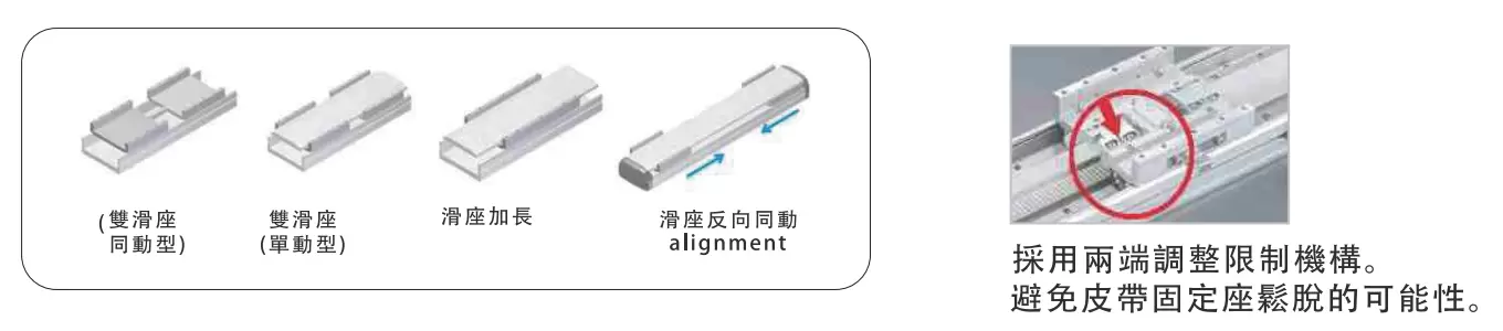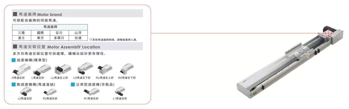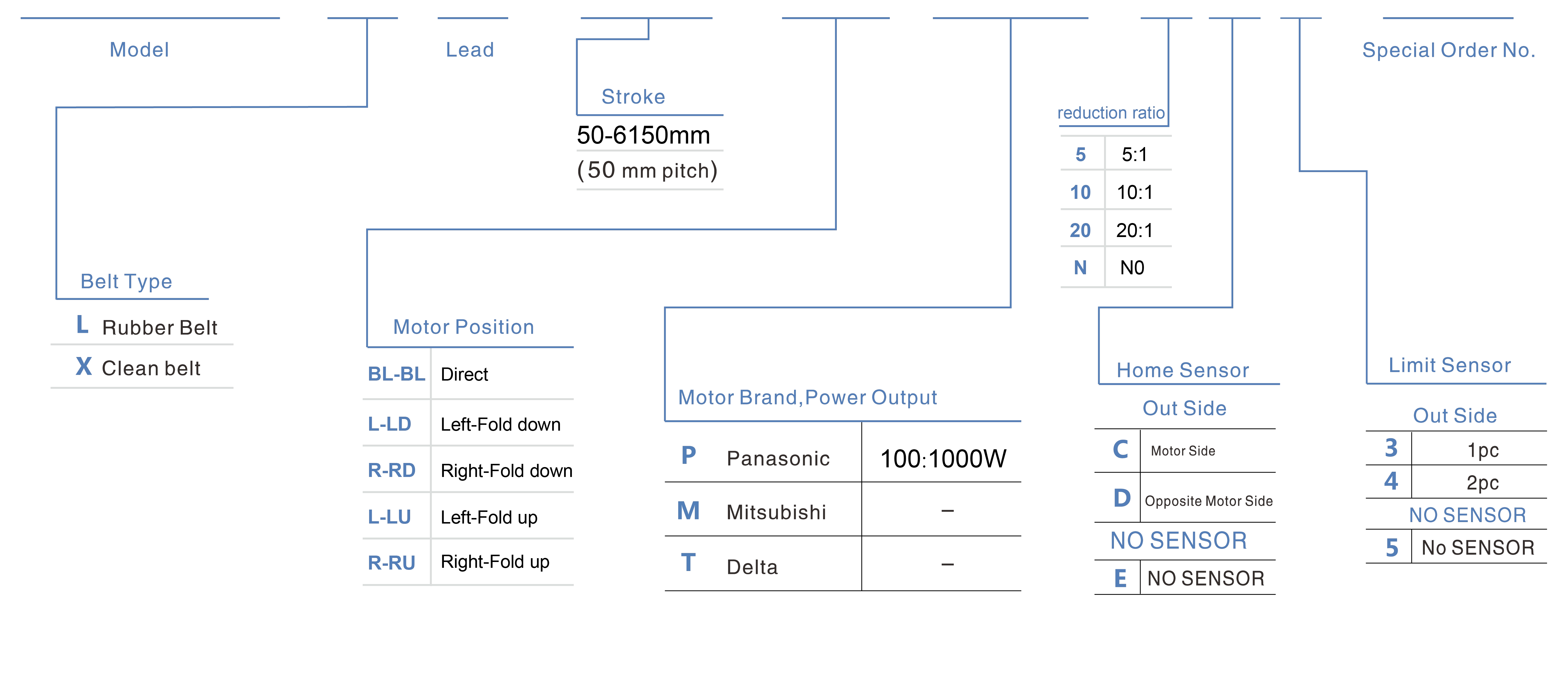 | ใช้ที่ไหน | โหมดขับเคลื่อน | ข้อมูลจำเพาะของรุ่น | กลไกการลด | เอาต์พุตมอเตอร์ (ว) | ความกว้าง (มม.) | ความสามารถในการทำซ้ำ (มม.) | ข้อมูลจำเพาะของสายพาน | น้ำหนักบรรทุกสูงสุด (กก.) | ความเร็วสูงสุด (มม./วินาที) *1 | ||