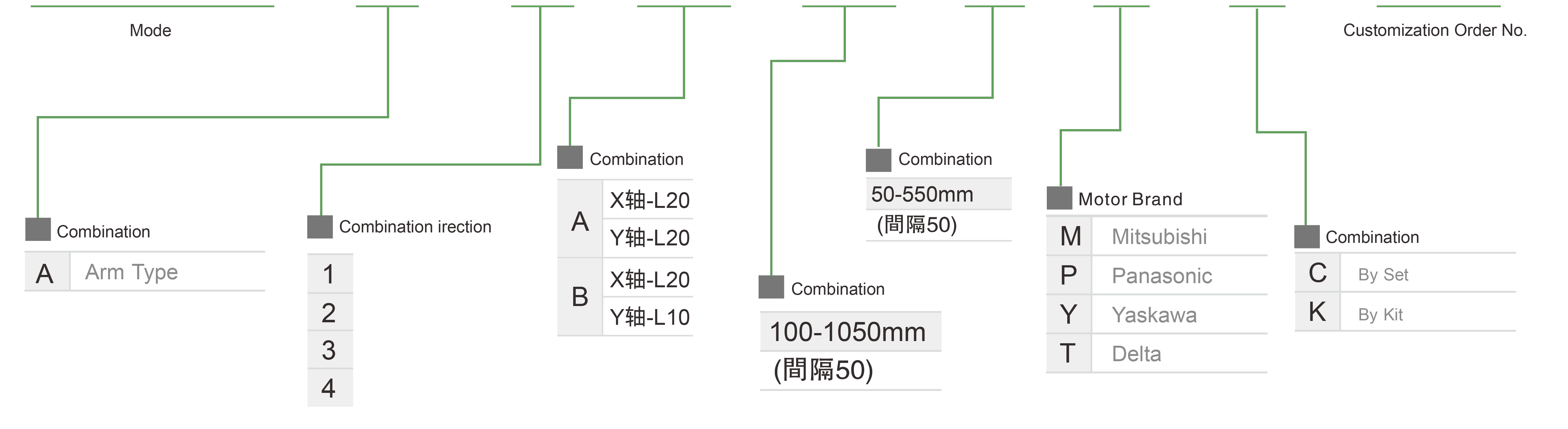 | มาตรฐาน | บอลสกรู | XYGH210-A | ประเภทแขน | 2 แกน | 20 | 2 | - | 1000 | 100 | - | 500~800 | 100~300 | - |