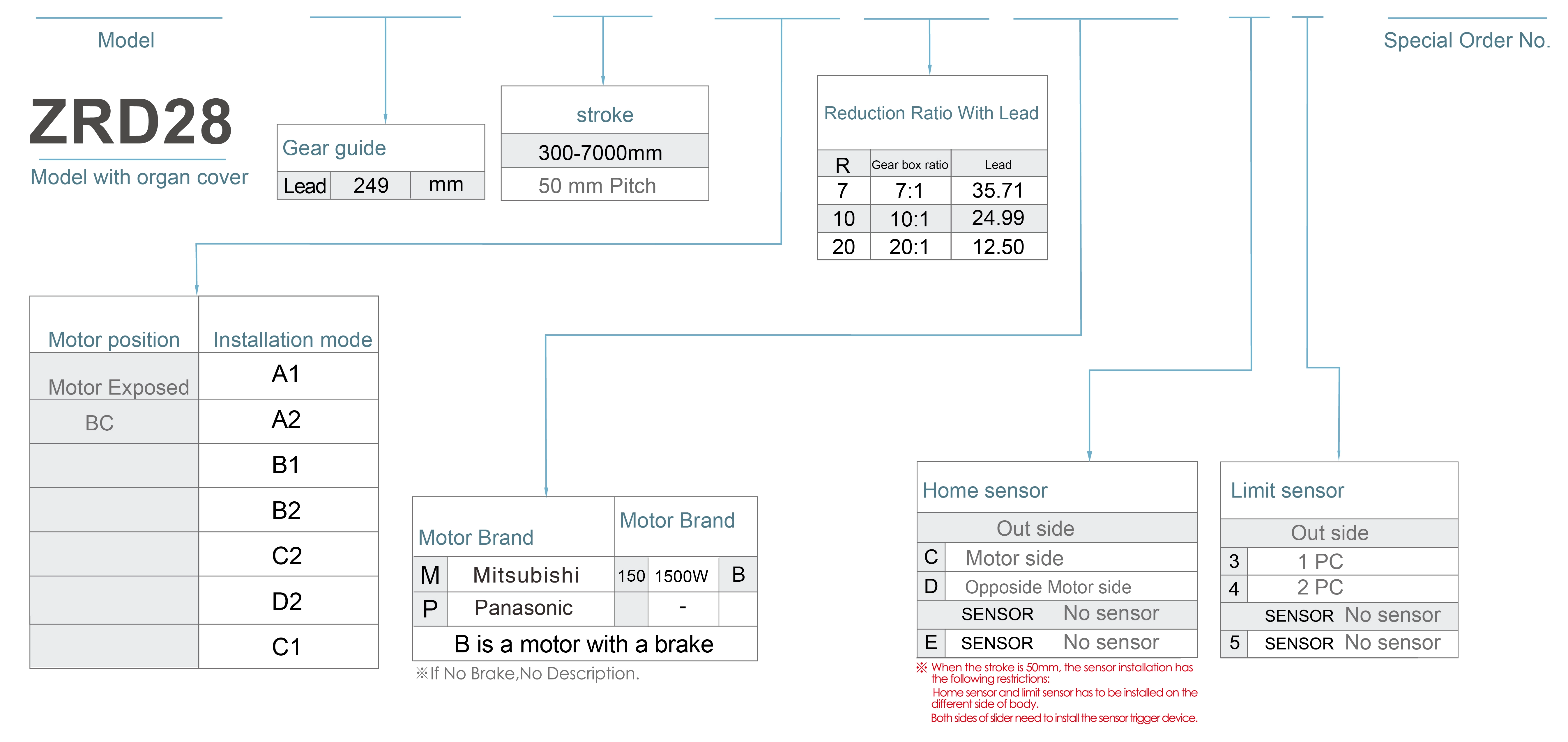 | ใช้ที่ไหน | โหมดขับเคลื่อน | ข้อมูลจำเพาะของรุ่น | กำลังไฟฟ้าขาออก (วัตต์) | ความกว้าง (มม.) | ความแม่นยำในการวัดซ้ำ (มม.) | อัตราส่วนของผู้ที่ลดลง | ขนาดเฟืองเกลียว (มม.) | น้ำหนักบรรทุกสูงสุด (กก.) | ความเร็วสูงสุด (มม./วินาที) *1 | |||